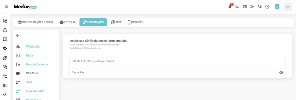 - Antes de conectar a Evolution, você deve informar as credenciais de acesso nas configurações